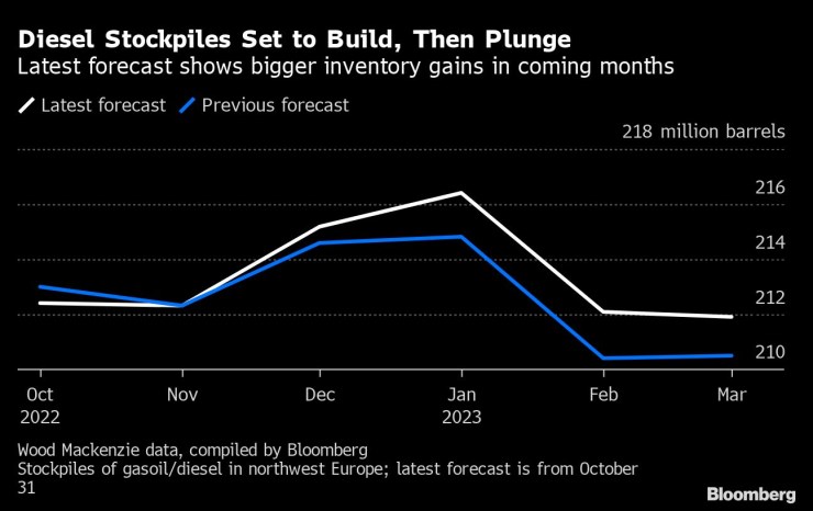 Запасите от дизелово гориво в Северозападна Европа ще достигнат най-ниското си ниво от поне 12 години в началото на пролетта на 2023 година, според прогноза на консултантската компания Wood Mackenzie Ltd, предаде Блумбърг, цитиран от БНР.