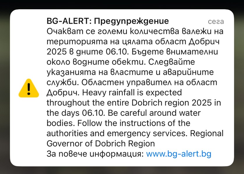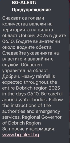 Областният управител на Добрич Живко Желязков задейства системата BG-ALERT. Точно в 17:00 часа жителите на област Добрич получиха предупреждения на телефоните си от системата за ранно оповестяване на населението в случаи на опасни събития, съобщи БНТ.