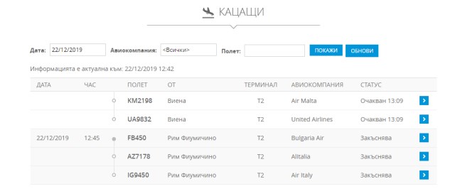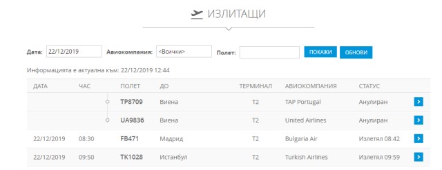 Справка на сайта на аеропорта показва, че определени полети изостават от графика. Средно закъсненията са между 10 и 30 минути, отменени полети за София няма.