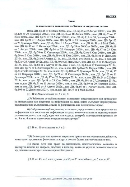 Предложените изменения в Закона за закрила на детето, предложени от депутати от коалицията "Продължаваме промяната - Демократична България", предизвикват сериозни опасения по отношение на безопасността и бъдещето на малолетните и непълнолетните. Според критиците на законопроекта, някои текстове могат да се използват за въвеждане на медицински процедури, свързани със смяна на пола при деца, под прикритието на психологическо лечение, което поставя здравето и психическото състояние на децата в риск.