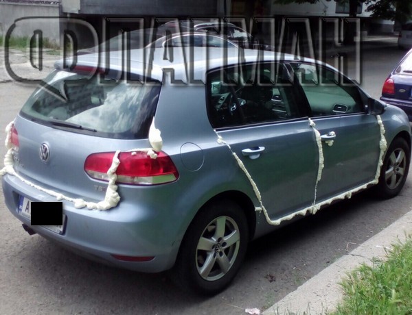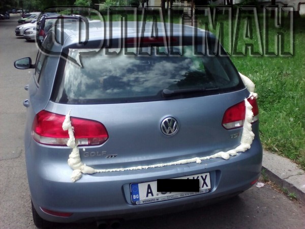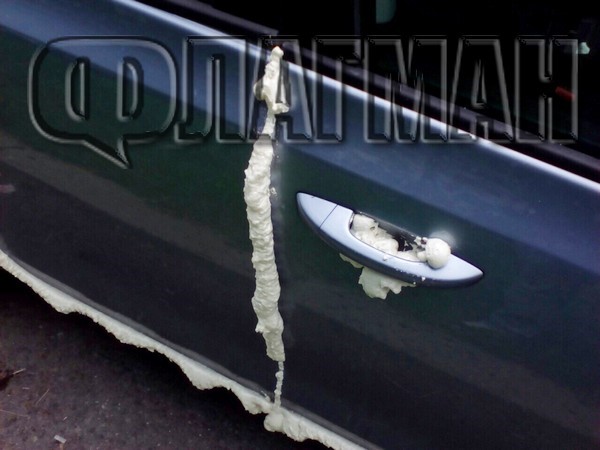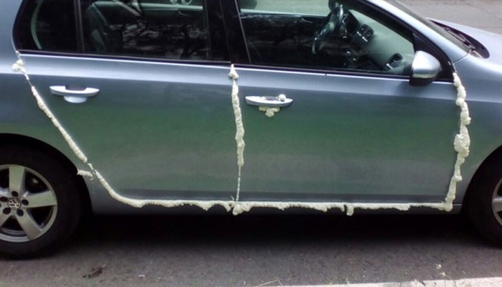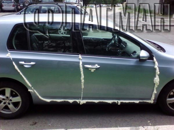 Вратите на автомобила са залепени с монтажна пяна. Автомобилът бе огледан от специалисти, които прецениха, че няма начин да бъде махнат строителният материал, тъй като плътно е полепнал по вътрешните части на автомобила.