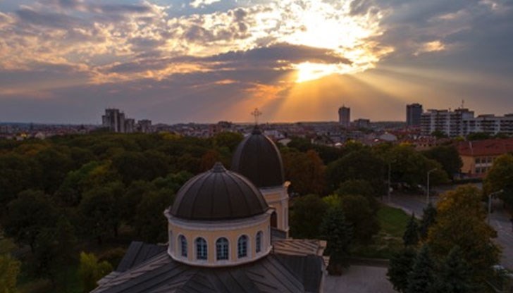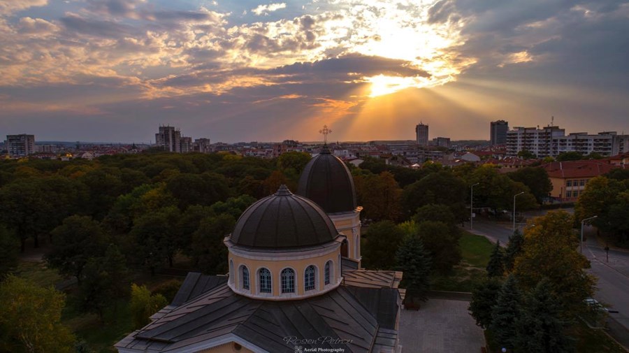 Росен Петров е заснел с дрон миг от залеза в Русе точно над новооткрития храм "Всех Святих".