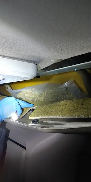 В хода на щателната физическа проверка инспекторите откриват в естествените кухини на шофьорската кабина единадесет пакета с марихуана с общо тегло 5763,81 грама. Заедно с тях е намерен и един пакет, съдържащ 1074,38 грама бяло прахообразно вещество, реагирало на кокаин.