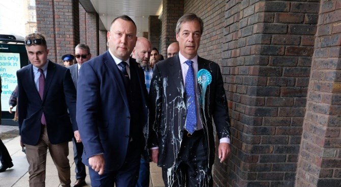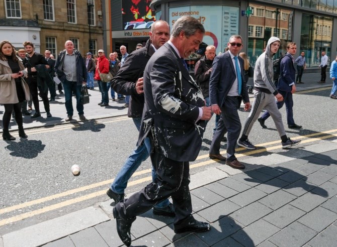 Найджъл Фараж, лидерът на новата британска "Партия на Брекзита", която води в допитванията до общественото мнение за европейските избори, беше залят в центъра на град Нюкасъл с млечен шейк. Видеозапис от "нетипичното" нападение срещу Фараж веднага се появи в социалните мрежи.
