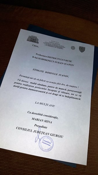 Рожденикът беше изненадан с поздравителен адрес и бутилка хубаво бяло вино, изпратени му лично от г-н Мариан Мина, председател на Окръжен съвет Гюргево. Към поздравите се присъедини и г-жа Лили Ганчева, изпълнителен директор на Еврорегион Данубиус, която му отправи своите най-искрени благопожелания.