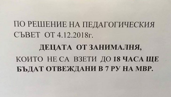 Бележката гласи, че децата на занималня, които не са били взети от родителите си до 18:00 часа ще бъдат отведени в 7 РУ на МВР.