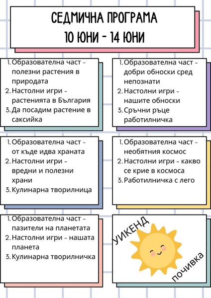 Записването ще продължи до запълването на бройките. При голям интерес ще помислим за допълнителни дати. Програмата предвижда различни занимания и развиване на нови умения чрез игра.