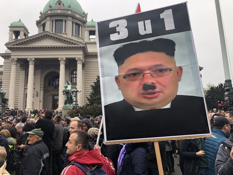 Множеството носи плакати, които са ръчно направени и свидетелстват за спонтанността на протеста. На тях се чете: „Приключил си!“, „Не съм тъп“, изписан върху националния флаг на Сърбия. Има и такива, които са в типичния сръбски стил: „Ако искам президентът да ме…, щях да гласувам за Ричард Гиър“. Един от най-любопитните е снимка на Вучич с очила, но с прическата на диктатора Ким Чен Ун и с мустачки на Хитлер и на него пише „Три в едно“.