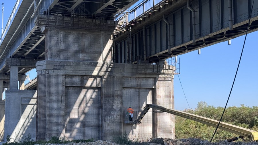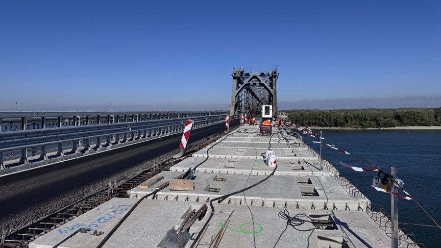 Подмяната на стоманобетонните пътни панели в 320-метровия участък в посока Румъния на Дунав мост при Русе вече е в ход. За последната седмица са монтирани 26 панела от общо 128, предвидени за затворената за ремонт отсечка. По трасето активно се поставят мрежи, армировка и болтови дюбели за закрепване на новите панели, а старият тротоар вече е премахнат.