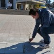 Работниците вадят увредените плочки, след което отново ги лепят на местата им.