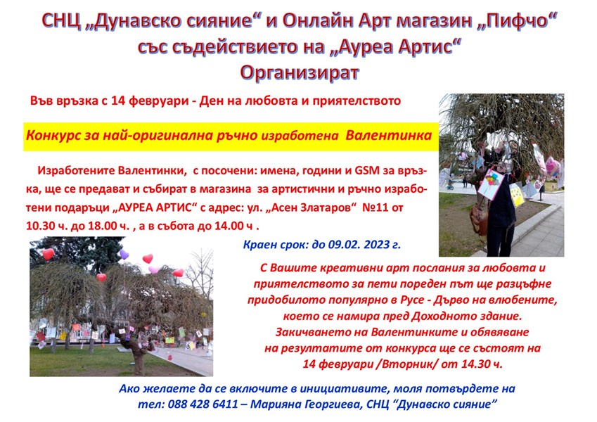 Във връзка с празника на Свети Валентин - Деня на влюбените, СНЦ „Дунавско сияние“, Онлайн Арт магазин „Пифчо“, „Ауреа Артис“ – магазин за артистични и ръчно изработени подаръци и Дворецът на Децата, организират поредица от събития, с които да провокират креативността на нашите съграждани да сътворяват и даряват любов и надежда.