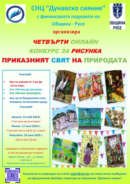 На 13 май /събота/ от 10:30 часа с поредица от инициативи в „Дворецът на децата“ официално ще се даде старт на Четвъртия онлайн конкурса за рисунка „Приказният свят на природа“, организиран от СНЦ „Дунавско сияние“ и финансиран от Община Русе.