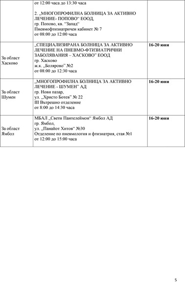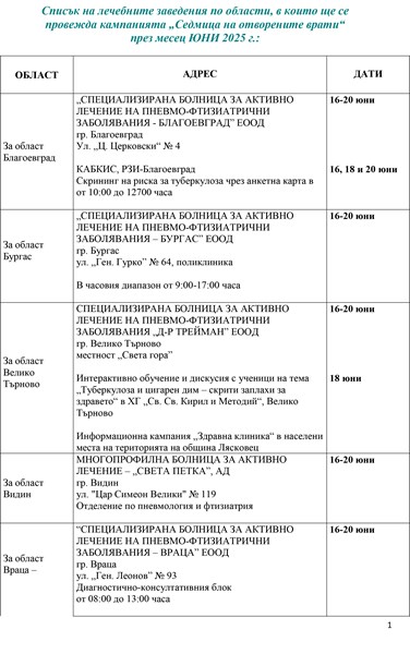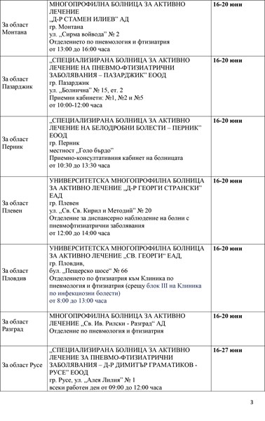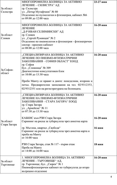 Кампанията ще продължи до 20 юни в болшинството области, докато в Русе прегледите ще се извършват до 27 юни, а в Кърджали и Силистра - от 23 до 27 юни. "Инициативата е доказала своята ефективност за повишаване на обществената информираност по отношение на заболяването туберкулоза", подчертаха от здравното министерство.