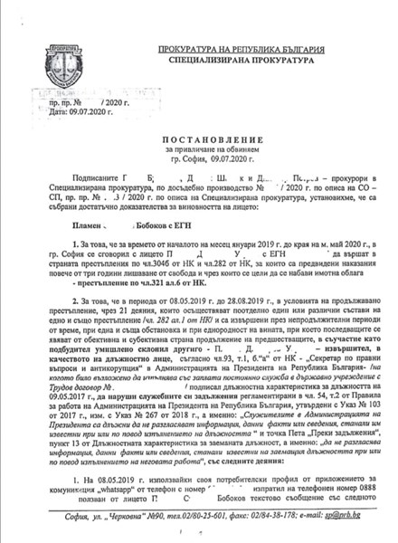 В духа на „големия обществен интерес“, по почина на Прокуратурата, публикуваме и правим общодостъпно Постановлението за привличане на обвиняем от 09.07.2020 г. на предприемачът Пламен Бобоков.