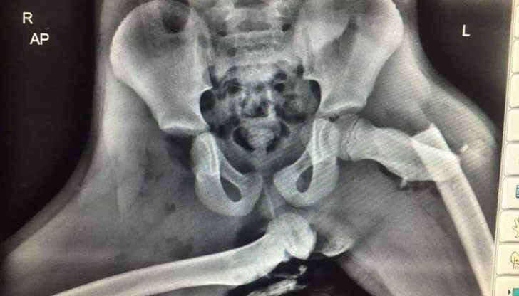 Рентгеновата снимка показва последиците за младо момиче, попаднало в катастрофа, докато държало краката си опрени на арматурното табло. Дори неспециалист може да види, че едната бедрена кост е счупена, а другата се е извадила от гнездото на таза, вероятно разкъсвайки меките тъкани в тази толкова деликатна област.