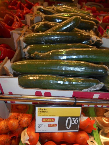 Тя е направена в магазин „Билла” в Братислава и ясно се вижда, че краставиците „на акция” са на цена от 0.35 евро, тоест 35 цента, което е около 70 стотинки.