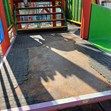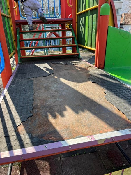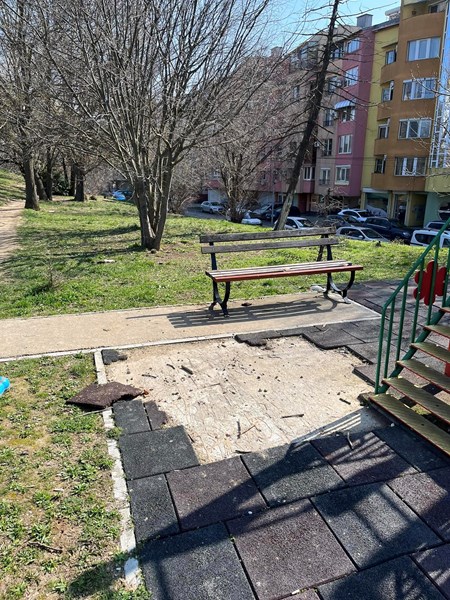 От публикуваните фотоси се виждат откъртеното специално покритие върху грубата асфалтова настилка. Без него площадките наистина стават опасни за малчуганите.