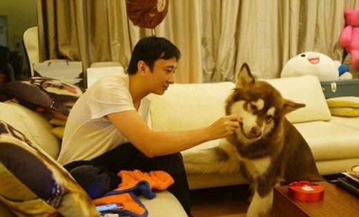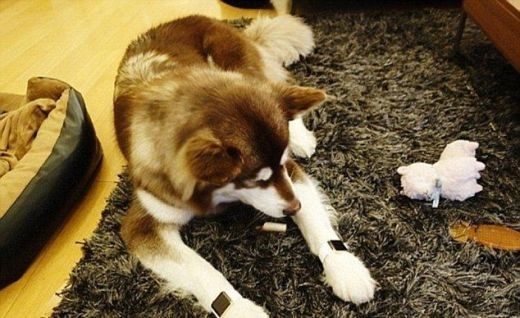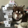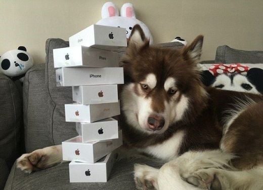 На разпространените в мрежата снимки тъжното сибирско хъски лежи в обкръжението на опаковки с нови айфони. Собственикът Коко явно се хвали с богатството си.