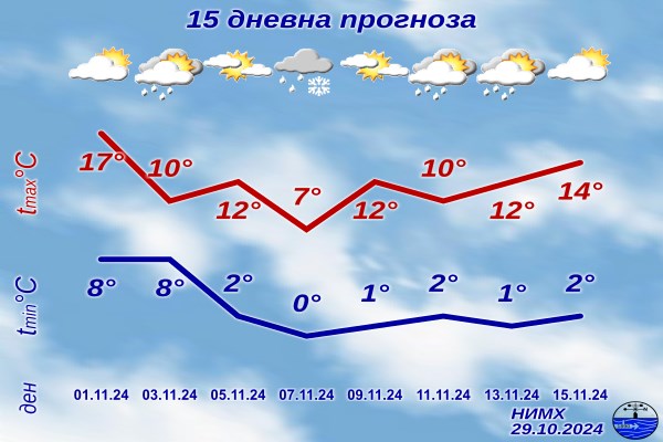 Предстои застудяване в началото на ноември, като над планинските райони се очакват първи снеговалежи на височина около 1000 метра.