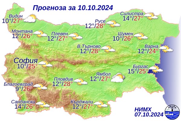 В четвъртък, 10 октомври, се очаква отново слънчево време и слаб южен вятър, с продължаващо затопляне.