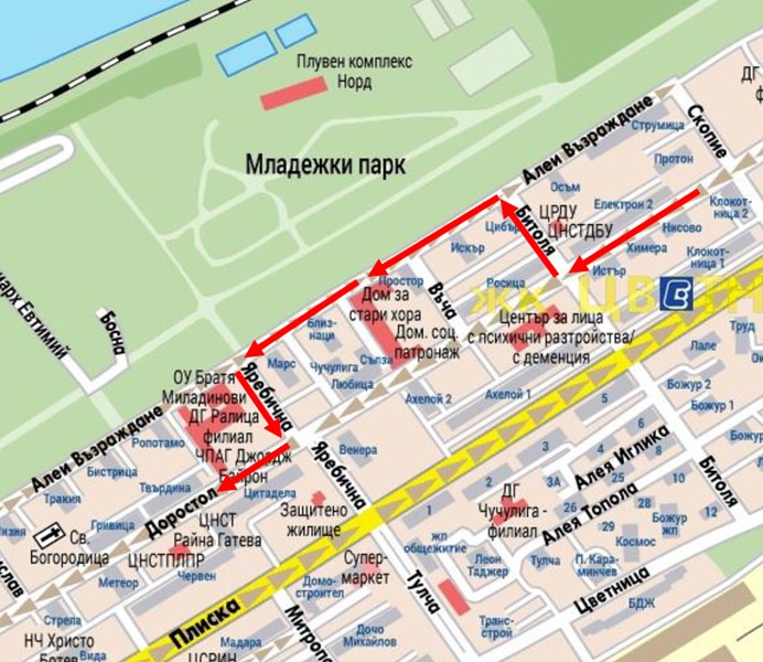за МПС, идващи от ЛВЗ към Център, по ул. „Доростол“, надясно по ул. „Битоля“, наляво по ул. „Алеи Възраждане“, наляво ул. „Яребична“ и надясно движението се възстановява по ул. „Доростол“;