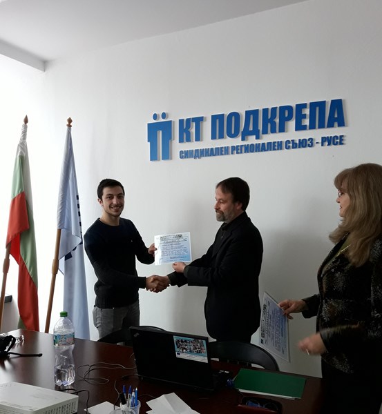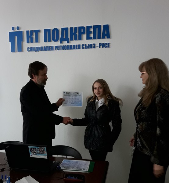 На 21 февруари 2017г. на финално занятие на част студентите от първата стартирала група, г-н Кирил Черкезов – Председател на СРС на КТ”Подкрепа” и г-жа Надка Бончева – Регионален секретар и ментор по проекта на студентите, връчиха сертификати за преминало практическо обучение в СРС на КТ”Подкрепа”.