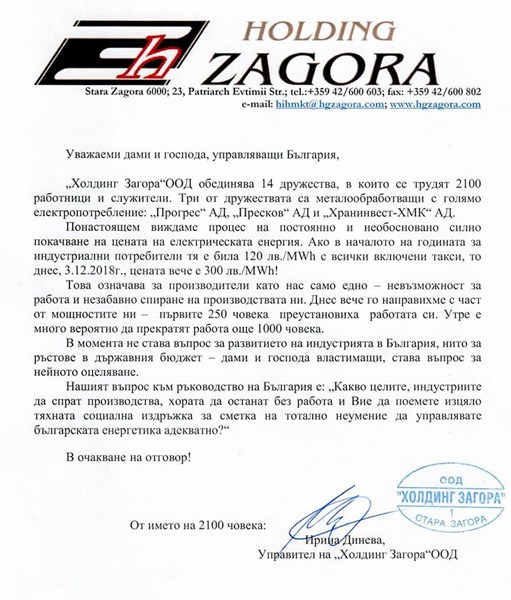 „Това означава за потребители като нас само едно – невъзможност за работа и незабавно спиране на производствата ни“, коментираха от „Холдинг Загора“ , в който са обединени 14 предприятия с 2100 работници и служители, а три от фирмите са металообработващи с голямо електропотребление – „Прогрес“ АД, „Пресков“ АД и „Хранинвест – ХМК“ АД.