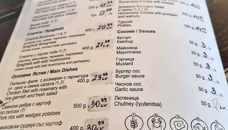 На снимката се вижда, че основните ястия в заведението са около 30 лева. Дори обикновена баница струва над 10 лева. Филия хляб пък е 0,50 лева, а купичка сос е 3 лв.