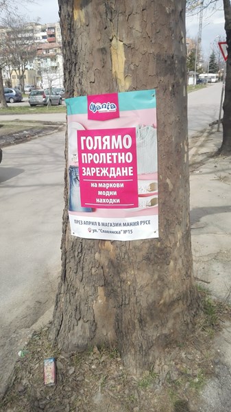 Тази сутрин квартал Родина в Русе осъмна с рекламни плакати на магазин за дрехи втора употреба.