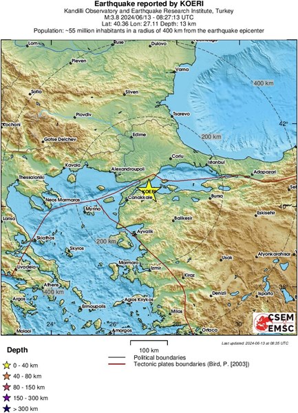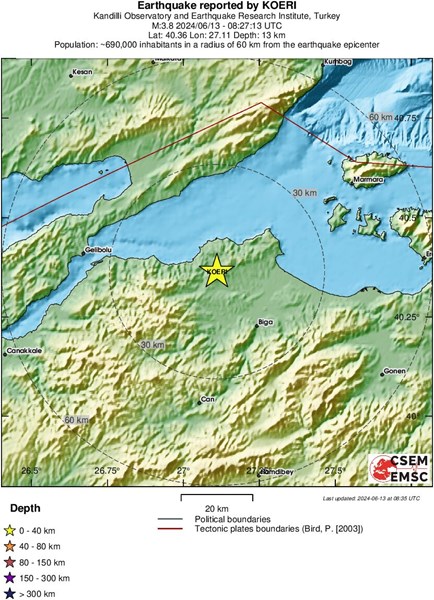 Трусът е станал в 11:27 ч. Епицентърът му е бил в град Бига, на дълбочина 13,4 километра, съобщават от Кандилли, предаде БТА.