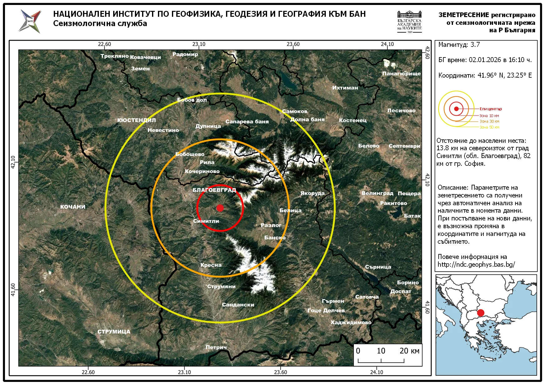 Сеизмичното събитие е станало около 16:32 часа българско време. Епицентърът е локализиран в непосредствена близост до областния център, в сеизмично активната зона на Югозападна България.