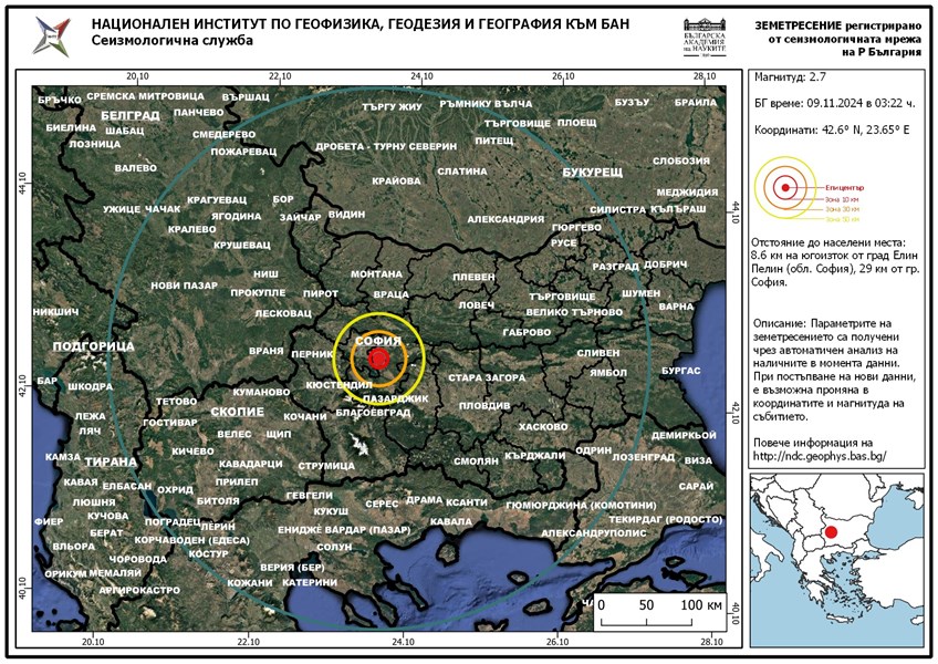 Земетресение с магнитуд 2.7 по Рихтер е регистрирано в района на град Елин Пелин през нощта срещу 09 ноември 2024 година. Трусът е усетен в 03:22 часа българско време, съобщават от Националния сеизмологичен център към Националния институт по геофизика, геодезия и география към Българската академия на науките (НИГГГ - БАН).