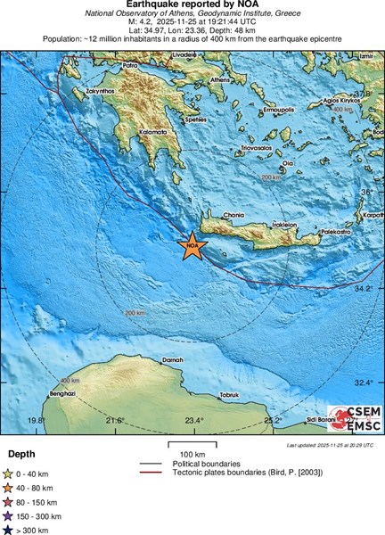 Според сеизмолозите, епицентърът на земетресението се намира в морето, на 167 километра западно от главния град Ираклион и на 41 километра югозападно от курортното селище Палеохора. Дълбочината на огнището е 48 километра, което го класифицира като трус с междинна дълбочина.