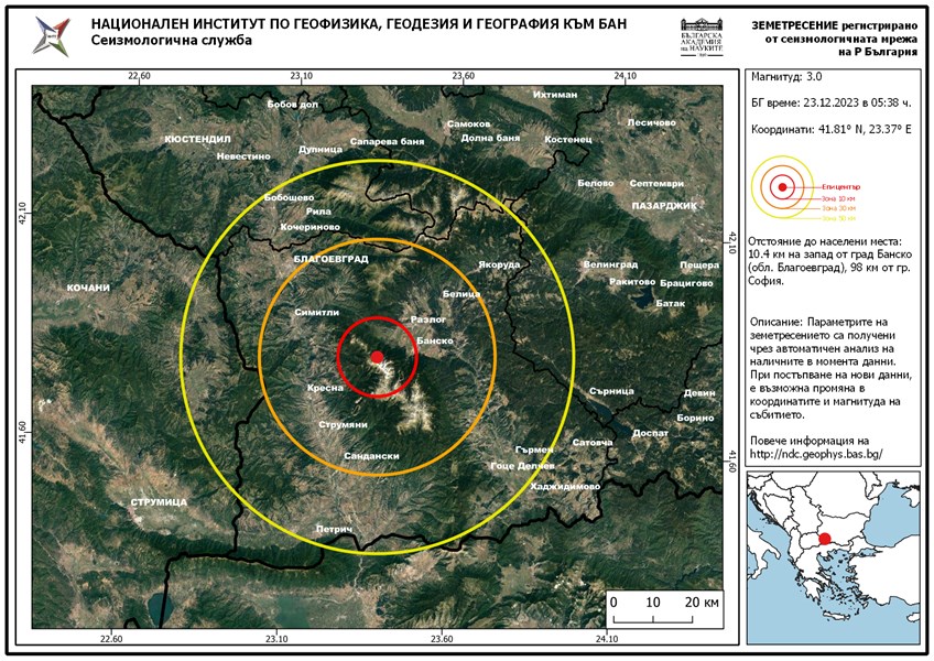 Трусът е бил на 10 км от Банско и на 98 км от София, информира НИГГГ - БАН.