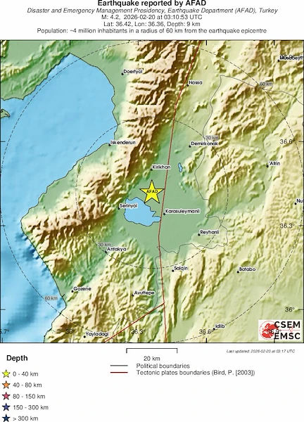 Епицентърът на земетресението се намира в град Къръкхан, според официалните данни на турската Дирекция за управление при бедствия и извънредни ситуации (АФАД).