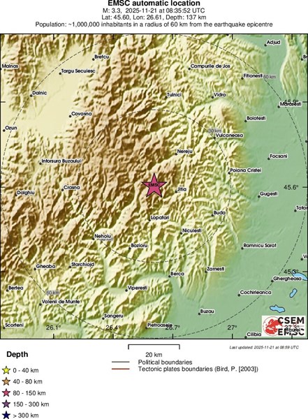 Земетресение с магнитуд 3.3 по скалата на Рихтер е регистрирано тази сутрин в Румъния, съобщиха от Националния институт за изследване и развитие на физиката на Земята (INCDFP).