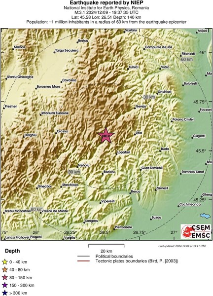 Земетресение с магнитуд 3.2 по Рихтер е регистрирано тази вечер в сеизмичната зона Вранча, Румъния. Трусът е станал в 21:37 часа местно време на дълбочина 140 километра.