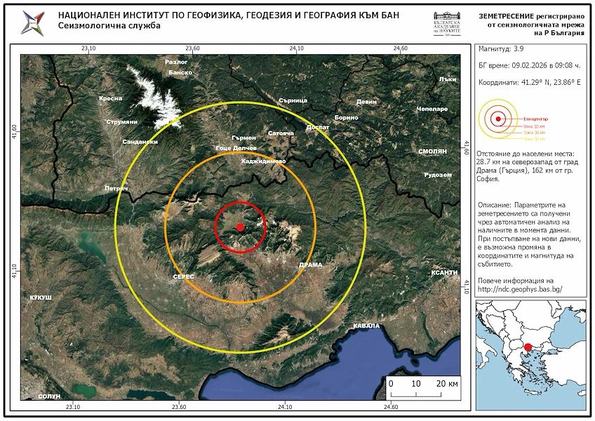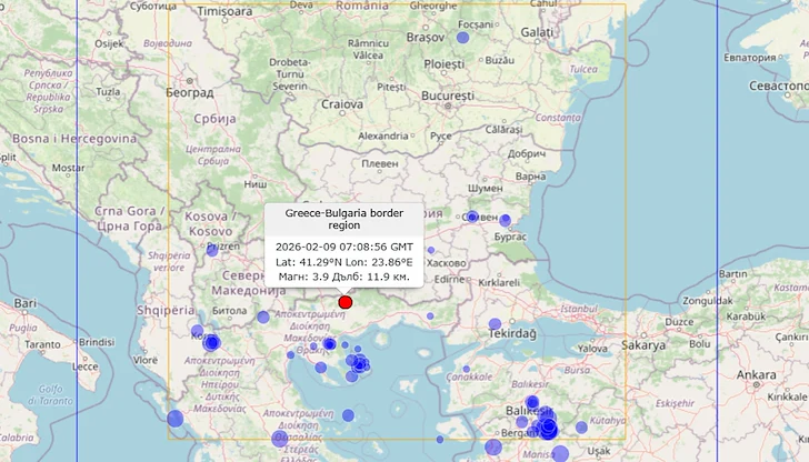 Земетресение с магнитуд 3.9 по скалата на Рихтер е регистрирано тази сутрин в 09:08 часа в граничния район между Гърция и България. Информацията беше потвърдена от Националния институт по геофизика, геодезия и география (НИГГГ) към БАН.