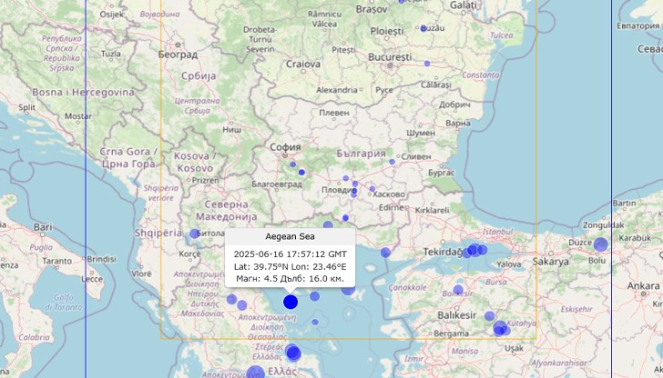 Трусът е регистриран в 20:57 часа българско време с епицентър на 185 км от Петрич