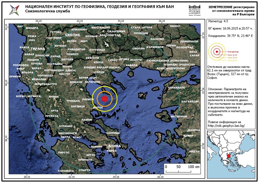 Трусът е станал на 16 юни в 20:57 часа българско време с епицентър на 185 километра от град Петрич, на 200 километра от Гоце Делчев и на 330 километра от София.
