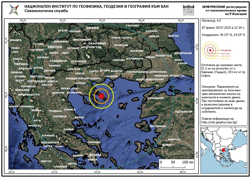 По официална информация, трусът е станал на 8 юли 2025 година в 22:39 часа българско време. Епицентърът е локализиран на 52,1 километра югоизточно от остров Каваканас, в Егейско море, на координати 40.25° северна ширина и 24.19° източна дължина.
