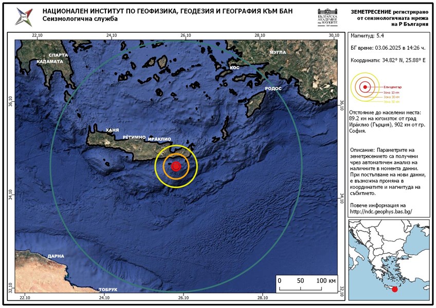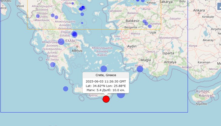 Силно земетресение с магнитуд 5,4 по Рихтер разтърси района на остров Крит в Гърция днес следобед. Трусът е регистриран в 14:26 часа българско време, съобщиха от Националния институт по геофизика, геодезия и география към БАН.