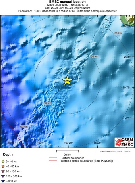Епицентърът на земния трус, усетен към 12:56 ч. по Гринуич, е бил в морето, на дълбочина 35 км, на около 23 км южно от град Изанжел.