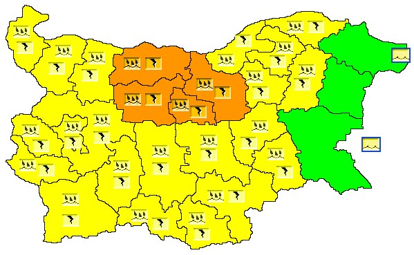 Жълт и оранжев код за опасно време с обилни валежи и гръмотевична активност е издаден в почти цяла България.