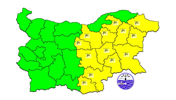 Регионите, в които е обявен жълт код за силен вятър са: Добрич, Варна, Бургас, Шумен, Търговище, Велико Търново, Габрово, Сливен, Ямбол, Хасково, Кърджали, Стара Загора и Хасково.
