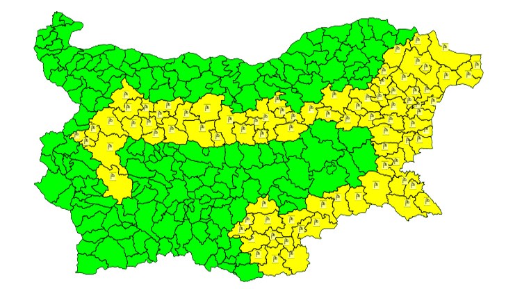 Обявен е жълт код в 15 области на Северна и Източна България заради силния вятър. Там се очаква да бъде скоростта му да достигне около 20-24 м/с, предаде БГНЕС.