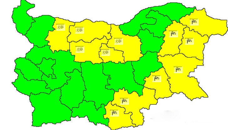 В областите Враца, Плевен, Ловеч, Габрово, Велико Търново, Добрич, Шумен, Варна, Бургас, Ямбол, Хасково и Кърджали през нощта и в сутрешните часове ще има условия за образуване на поледици.От НИМХ предупреждават, че при тази степен на предупреждение са възможни ограничения при дейности на открито и хората хората трябва да са внимателни, когато вървят или шофирате при заледени повърхности.