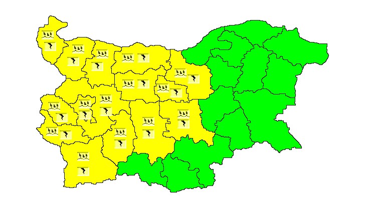 В тези 15 области на страната утре след обяд и до полунощ ще има локални интензивни, значителни по количество валежи - до 25-30 литра на квадратен метър, придружени с гръмотевични бури.