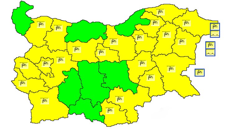 Жълтият код e в сила за областите: Монтана, Враца, София-област и София, Перник, Кюстендил, Благоевград, Ловеч, Габрово, Велико Търново, Силистра, Разград, Търговище, Сливен, Ямбол, Шумен, Добрич, Варна, Бургас, Хасково, Кърджали.