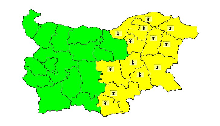 Жълт код за горещо време с максимални температури над 35° е обявен в 13 области в страната - Търговище, Варна, Шумен, Добрич, Разград, Кърджали, Хасково, Стара Загора, Русе, Силистра, Сливен, Бургас, Ямбол. Това съобщават от Националния институт по метеорология и хидрология (НИМХ).